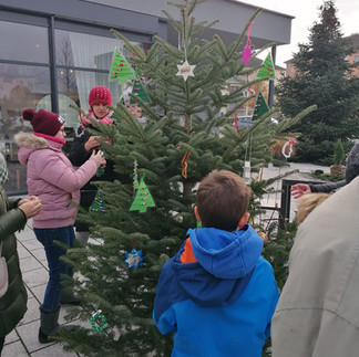 Sonderschule und Volksschule haben viele Projekte gemeinsam geplant. Eines davon ist das Schmücken des Weihnachtsbaumes bei der Gemeinde.